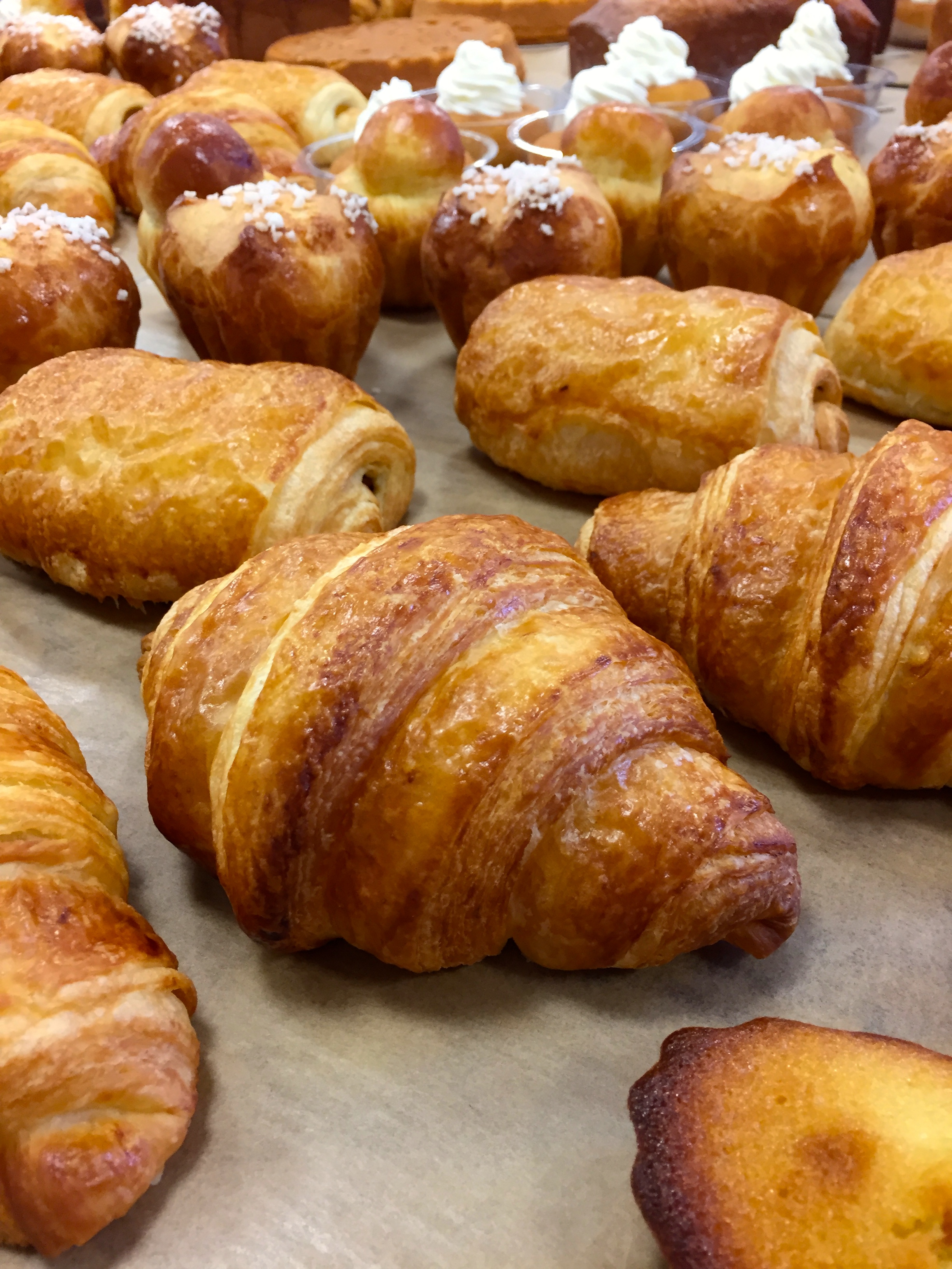 Coucou les toqués(ées) ! Avoue-le, tu attends avec impatience que je te fasse le retour de ma semaine, dédiée cette fois-ci à la viennoiserie avec nos professeurs Olivier et Valérie. Au programme, fabrication de croissants, pains au chocolat, brioches, savarins, pain de gênes, madeleines et du gâteau du week-end. Les viennoiseries sont des produits dont les techniques de fabrication rappellent celles du pain ou de la pâte feuilletée mais auxquels leurs ingrédients donnent un caractère plus gras et plus sucré les rapprochant ainsi de la pâtisserie.